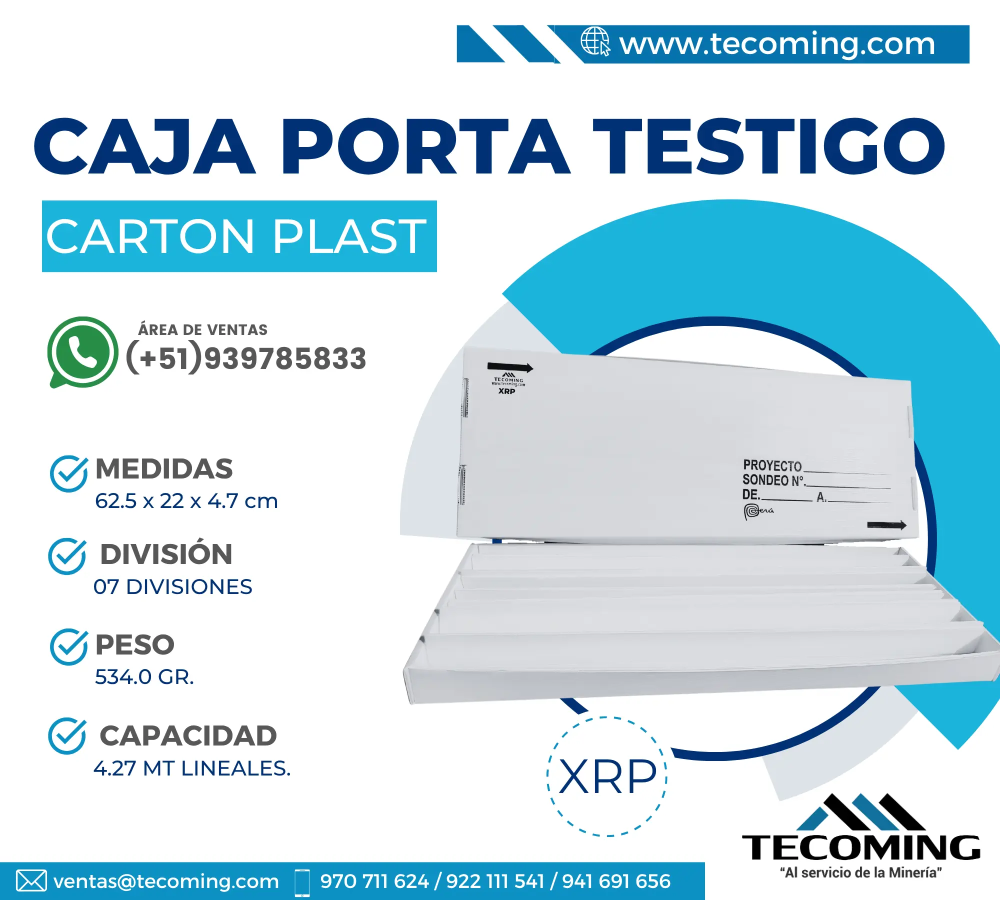 Productos para almacenamiento y registro de muestras de minerales, aplicable en el sector de la industria minera, geológica y exploración diamantina. MATERIAL: Cartón plast (polipropileno) LINEAS: BQ,NQ,HQ,PQ,XRP -Cuentan con un sistema práctico, seguro y muy fácil de transportar Ventajas: - Ligeros - Lavables - Higiénicos - 100% reciclables - Fácil de armar, no requiere sellado, grapas, ni pegamento Para mayor información de nuestros productos, contáctenos en: Móvil / Whatsapp: 51-922111541 51-939785833 ( 51) 941691656 Teléfono: (511) 4805856 Escríbenos en: ventas@tecoming.com Web: www.tecoming.com Tenemos videos informativos en nuestro canal de YOUTUBE, entra aquí: https://www.youtube.com/watch?v=TQklY3gSTI4