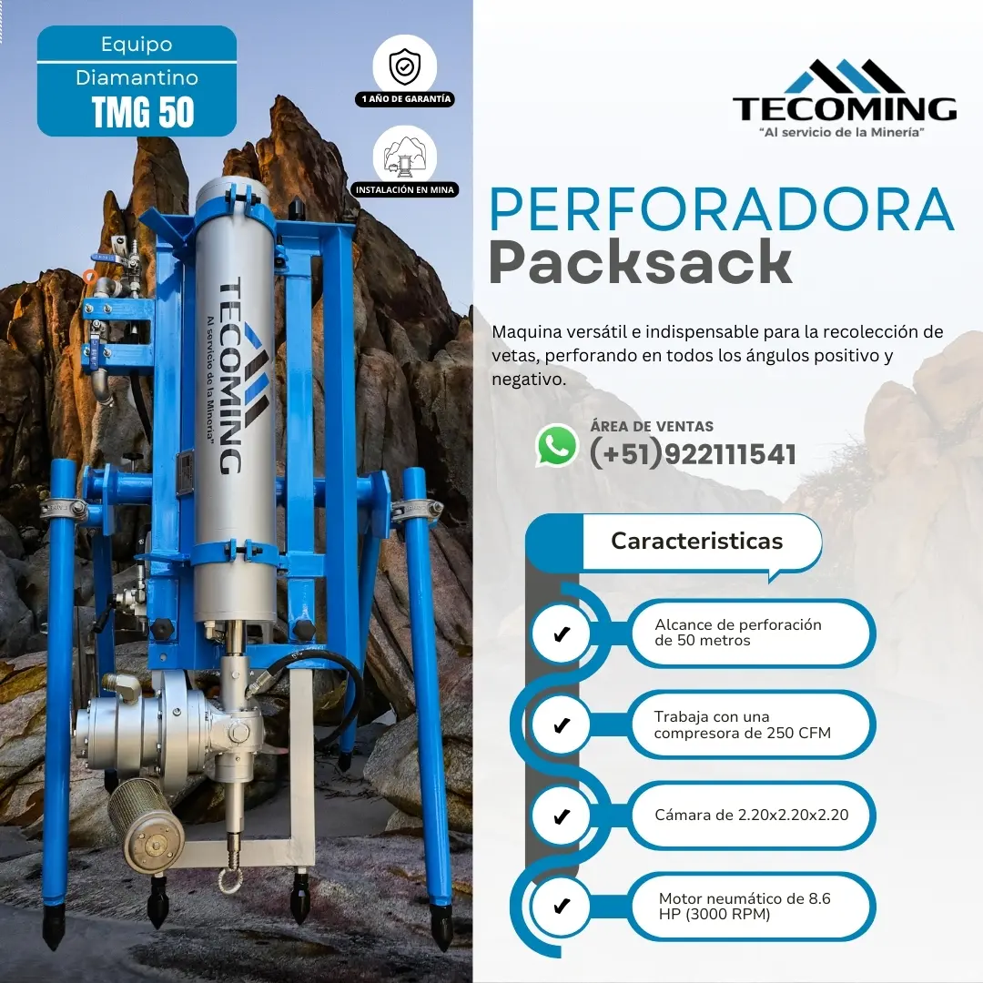 La PackSack TMG-50 es un equipo neumático de alta eficiencia, diseñado para la recolección de vetas, testigos y muestras geológicas durante las labores de exploración y perforación minera. Fabricada bajo estándares de calidad comprobados, ofrece rendimiento, durabilidad y ergonomía, garantizando una operación confiable en condiciones exigentes de campo. CARACTERÍSTICAS TÉCNICAS Alcance de perforación: Hasta 50 metros de profundidad. Diámetro de muestra: 23 mm. Versatilidad de trabajo: Permite perforar en todos los ángulos (positivos y negativos), optimizando el uso de recursos y reduciendo costos operativos. Sistema de operación: Funciona con compresora de aire de 250 CFM, garantizando una potencia constante y eficiente. Diseño ergonómico: Facilita la manipulación del equipo, reduce la fatiga del operador y mejora la productividad en campo. Construcción robusta: Estructura reforzada y componentes metálicos de alta resistencia, ideales para entornos mineros de alto desgaste. SERVICIO POST-VENTA Instalación y capacitación en mina a cargo de un técnico especialista. Garantía de 1 año por defectos de fabricación. Entrega de manual técnico y de partes. Incluye accesorios originales para una operación segura y completa. Asistencia virtual 24/7, con soporte técnico especializado y atención inmediata. Contáctanos: WhatsApp / Celular: ( 51) 922 111 541 ( 51) 939 785 833 ( 51) 941 691 656 Teléfono fijo: (01) 480 5856 Correo: ventas@tecoming.com Web: www.tecoming.com