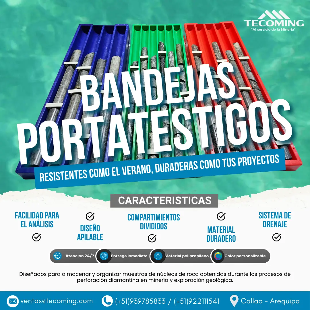 Productos para almacenaje y registro de muestras de minerales, para el sector minero, geólogo y exploración diamantina. CARACTERISTICAS -Material: Plástico PP. -Modelo: BQ, NQ, HQ, PQ -Capacidad: 6-5-4-3 metros lineales. -Proceso: Inyección -Personalizado: Color y etiquetas. También contamos con las tapas y separadores/tacos, complementos de las bandejas porta testigo. Contáctanos en: WhatsApp-celular: ( 51)-922111541 ( 51) 939785833 ( 51) 941691656 Teléfono: (511) 4805856 E-mail: ventas@tecoming.com Web: https://tecoming.com/