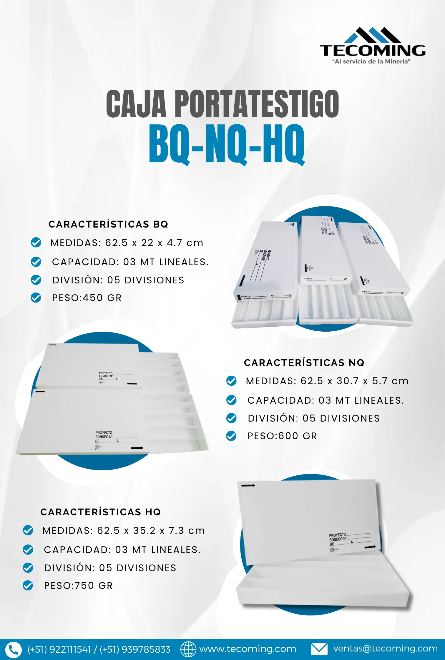 Fabricadas en polipropileno corrugado de alta resistencia, garantizan la integridad de testigos geológicos durante manipulación, transporte y almacenamiento. CARACTERÍSTICAS TÉCNICAS Material: Cartón Plast (polipropileno corrugado), resistente a humedad y desgaste Líneas disponibles: BQ, NQ, HQ, PQ, XRP Sistema de armado rápido sin sellado, grapas ni pegamento Estructura robusta para transporte seguro VENTAJAS Ligeras: Peso reducido, fácil manipulación Lavables y reutilizables Higiénicas: Material no poroso, evita contaminación cruzada 100% reciclables Fácil armado sin herramientas adicionales Contáctanos: WhatsApp / Celular: ( 51) 922 111 541 ( 51) 939 785 833 ( 51) 941 691 656 ( 51) 945 901 699