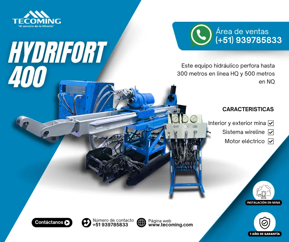 Perforadora hidráulica de alta capacidad para exploración y perforación diamantina en proyectos mineros de gran envergadura. Equipada con tecnología Wireline y cabezal pasante HQ, ofrece mayor profundidad, eficiencia y seguridad en recuperación de testigos geológicos. CARACTERÍSTICAS TÉCNICAS Alcance: Hasta 400 metros con cabezal pasante HQ Sistema Wireline para extracción rápida sin sacar columna completa Operaciones seguras con altos estándares de protección SERVICIO POST-VENTA Garantía de 1 año por defectos de fabricación Capacitación e instalación en mina por técnicos especializados Asistencia virtual 24/7 con soporte técnico Contáctanos: WhatsApp / Celular: ( 51) 941 691 656 ( 51) 942 842 832 ( 51) 939 785 833 ( 51) 945 901 699