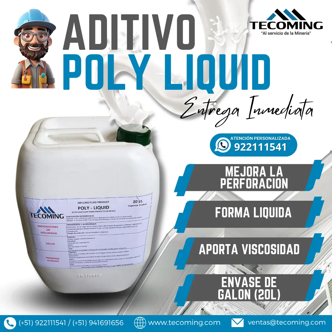 Polímero aniónico de alto peso molecular en forma líquida que produce rápido aumento de viscosidad sin problemas de mezclado. Sistema completo de fluidos de perforación que se mezcla rápidamente con agua fresca o salubre FUNCIÓN Viscosificante líquido de rápida acción para sistemas de fluidos de perforación. Polímero estable, no tóxico y no fermentable que mejora propiedades reológicas y reduce problemas operativos en perforación diamantina y pozos de agua. CARACTERÍSTICAS Y BENEFICIOS -Rápido aumento de viscosidad sin problemas de mezclado -Económico: Requiere bajas concentraciones -Reduce pegada de barras y formación de anillos -Disminuye torque y vibración de las barras Contáctanos: WhatsApp / Celular: ( 51) 922 111 541 ( 51) 939 785 833 ( 51) 941 691 656 ( 51) 945 901 699