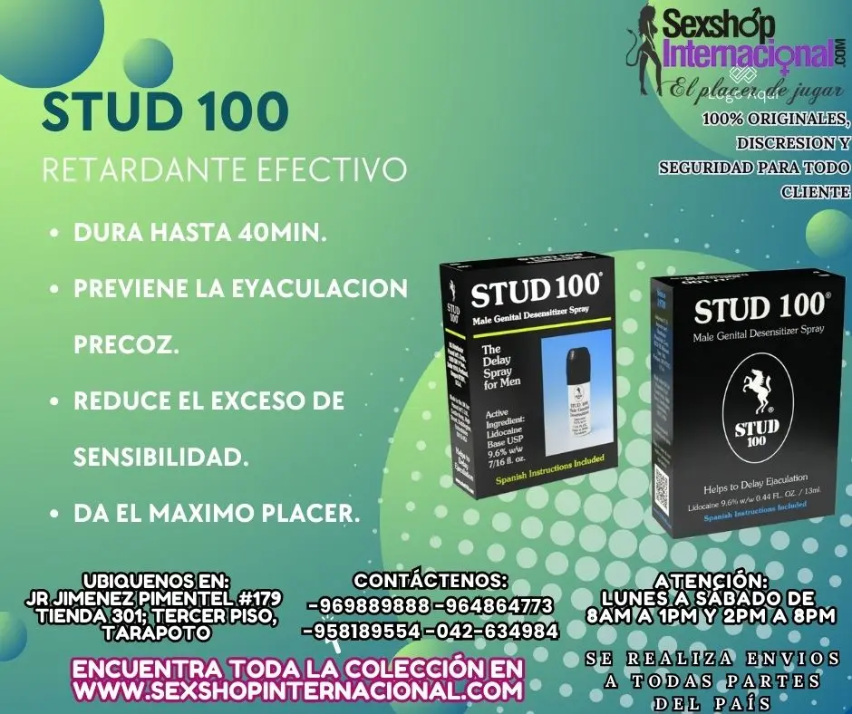 Envios a todas partes del país. retardante spray stud 100 nomas eyaculacion precoz tarapoto sextoys stud 100 es un spray que permite durar mas tiempo, hasta 40min los encuentros, reduce el exceso de sensibilidad, previene la eyaculacion prematura. Visitenos en nuestra tienda y velo por ti mismo, que no te lo cuenten. SEXSHOP INTERNACIONAL TARAPOTO Nos puede ubicar en el Jr. Jimenez Pimentel #179 Tienda -301 Tercer Piso- TARAPOTO-PERU REF:ALTURA PLAZA DE ARMAS COSTADO DE CAJA HUANCAYO Realizamos envíos a nivel nacional e internacional. https://sexshopinternacional.com/ www.sextoyslima.com www.tiendasamor.com www.fantasiasexsual.com
