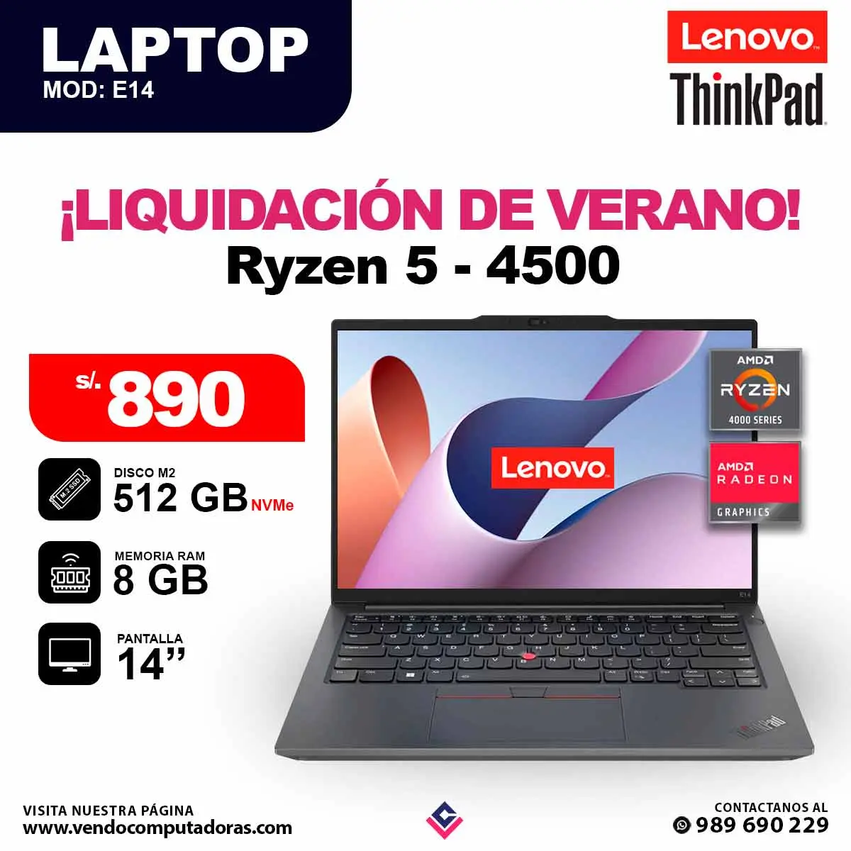 Trabaja, estudia y crea sin límites. Especificaciones: Ryzen 5 - 4500 | RAM 8 GB | M2 512 GB NVMe | Modelo: E14 Pantalla: 14 Lista para usar desde el primer minuto Ideal para trabajo, estudio u oficina Entrega rápida en Lima Garantía asegurada Escríbenos al 989 690 229 ¡No te quedes sin la tuya!