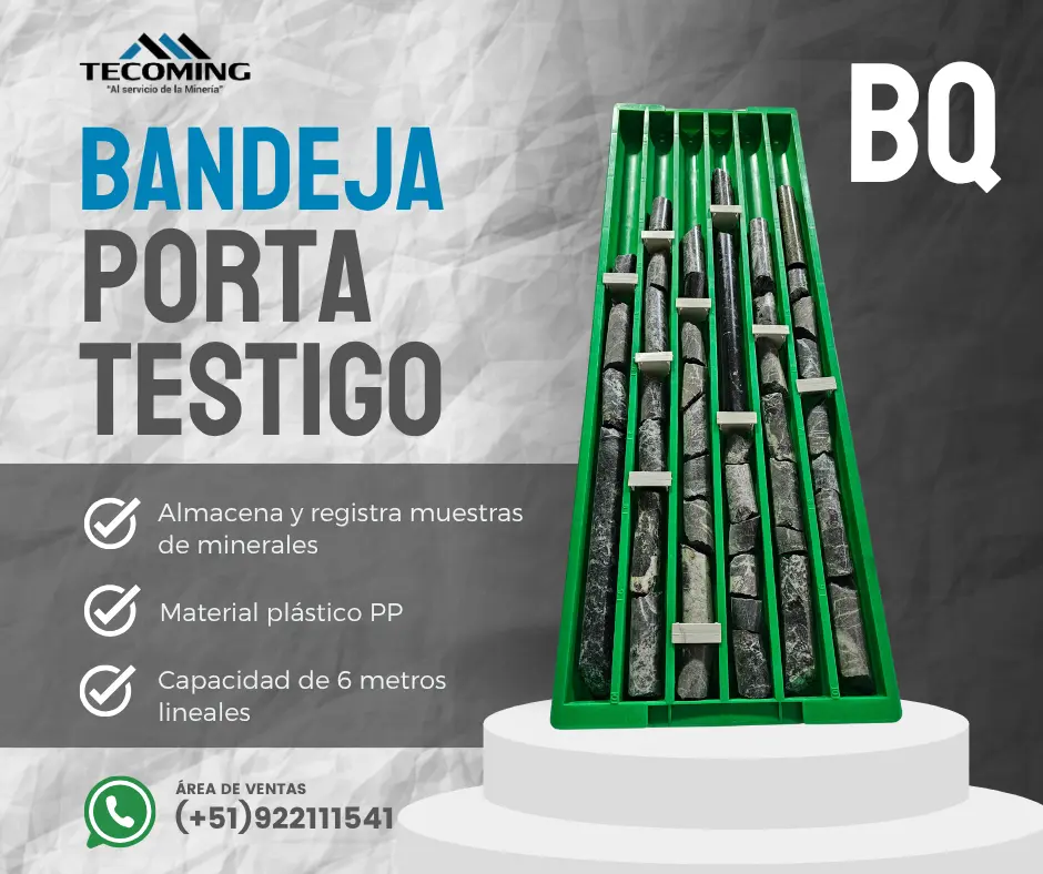 Fabricantes nacionales de bandejas porta testigo línea BQ, diseñadas para almacenamiento, registro y transporte seguro de muestras geológicas de perforación diamantina. CARACTERÍSTICAS TÉCNICAS Línea: BQ Capacidad: 6 metros lineales de testigo Material: Polipropileno (PP) de alta resistencia Resistencia: Superior frente a impactos, humedad, rayos UV y condiciones extremas Proceso: Inyección plástica de precisión Diseño ergonómico y apilable con fondo reforzado Sistema de drenaje integrado Área lateral para rotulado o etiquetas ACCESORIOS COMPLEMENTARIOS Tapa porta testigo Separadores / Tacos Contáctanos: WhatsApp / Celular: ( 51) 922 111 541 ( 51) 939 785 833 ( 51) 941 691 656 ( 51) 945 901 699