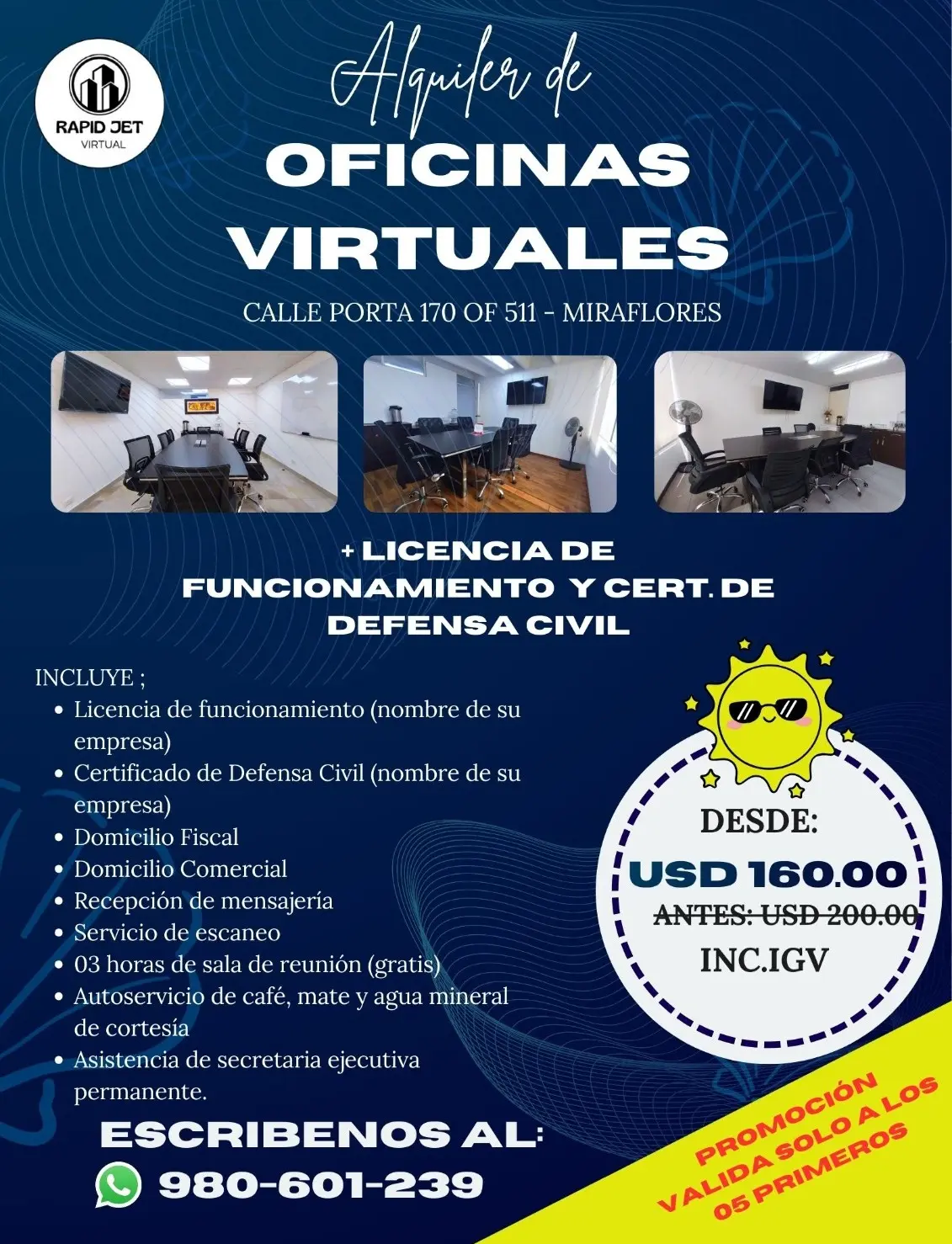 Impulsa tu empresa con una Oficina Virtual en Miraflores, Calle Porta 170 Of. 511. Incluye Licencia de Funcionamiento y Certificado de Defensa Civil a nombre de tu empresa, domicilio fiscal y comercial, recepción de correspondencia, servicio de escaneo y 3 horas de sala de reuniones gratis. Desde USD 160.00 (incluye IGV).!!! Contáctanos al 980-601-239 y formaliza tu negocio hoy mismo.