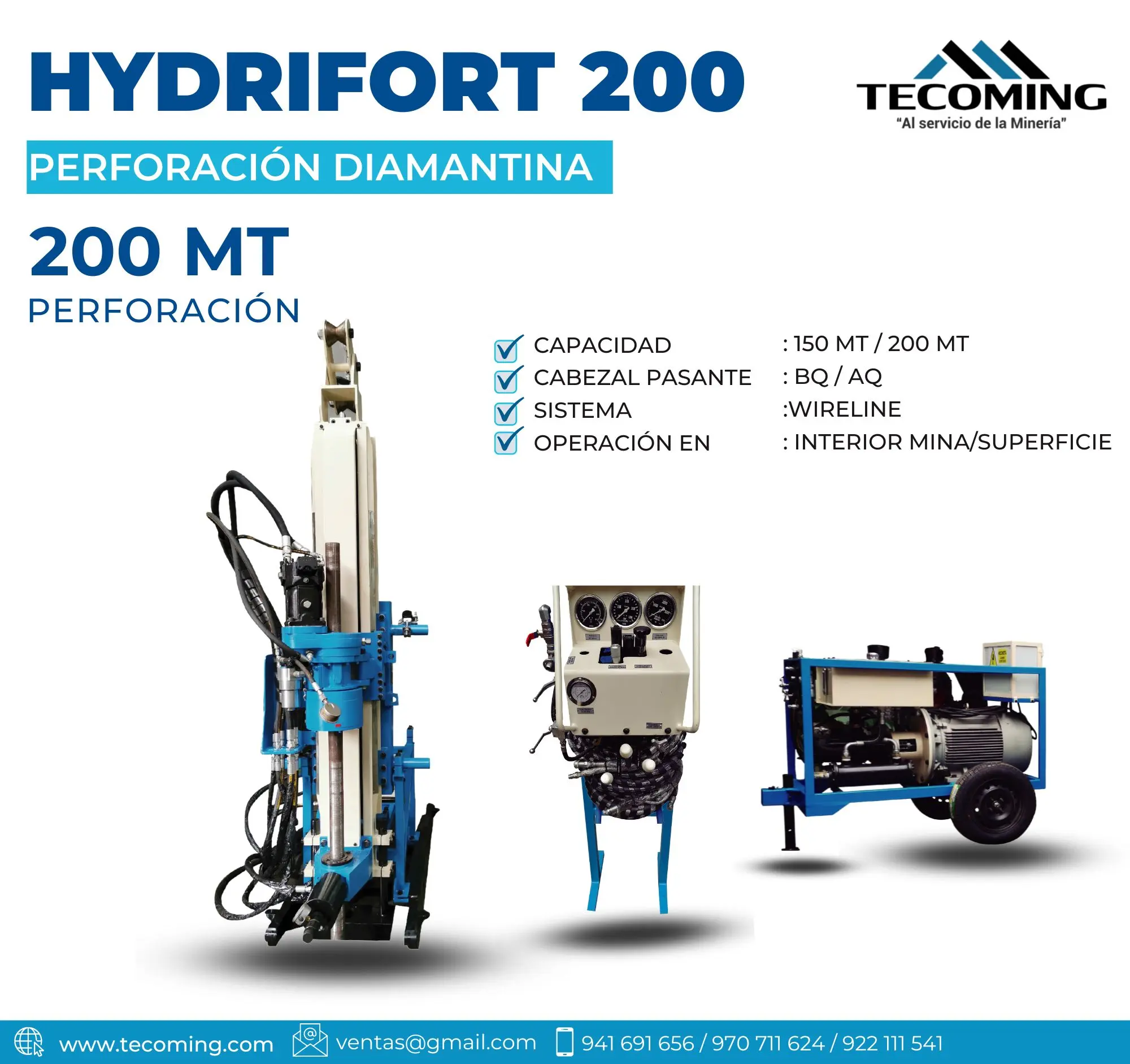 Perforadora hidráulica compacta y eficiente para proyectos de exploración minera de mediana profundidad. Equipada con tecnología Wireline y cabezal pasante BQ, CARACTERÍSTICAS TÉCNICAS Alcance: Hasta 150 metros con cabezal pasante BQ Sistema Wireline para extracción rápida Operaciones seguras con diseño ergonómico Compacta Construcción robusta con componentes hidráulicos de alta calidad SERVICIO POST-VENTA Garantía de 1 año por defectos de fabricación Capacitación e instalación en mina por técnicos especializados Manual técnico y de partes incluido Stock de accesorios originales disponibles Asistencia virtual 24/7 con soporte técnico Contáctanos: WhatsApp / Celular: ( 51) 922 111 541 ( 51) 945 901 699 ( 51) 939 785 833 ( 51) 941 691 656 Teléfono fijo: (01) 480 5856 Correo: ventas@tecoming.com Web: www.tecoming.com YouTube: https://www.youtube.com/watch?v=TQklY3gSTI4 #EcoMineria #MineriaVerde #ProduccionResponsable #CompromisoAmbiental #TECOMING #MiningInnovation #GeologyTools #DiamondDrilling