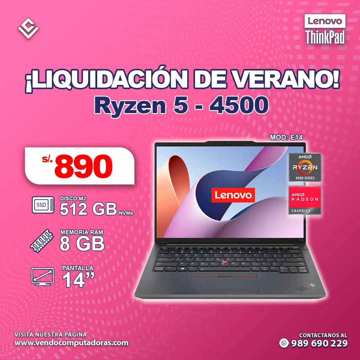 Trabaja, estudia y crea sin límites. Especificaciones: Ryzen 5 - 4500 | RAM 8 GB | M2 512 GB NVMe | Modelo: E14 Pantalla: 14 Lista para usar desde el primer minuto Ideal para trabajo, estudio u oficina Entrega rápida en Lima Garantía asegurada Escríbenos al 989 690 229 ¡No te quedes sin la tuya!