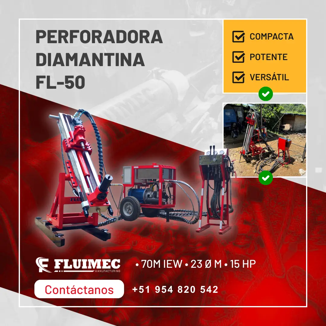 PERFORADORA PACKSACK FL-100 Explora hasta 150 m en AQ y 50 m en BQ, con testigos de 27 mm y 36 mm. Cuenta con una potencia de 30 HP y un abanico de trabajo de 180°, ideal para perforaciones y sondajes precisos. Somos Fluimec, fabricantes y distribuidores de la marca Packsack. Garantizamos el stock permanente de accesorios y repuestos originales. ¡SOLICITA TU COTIZACIÓN AHORA! 51 954 820 542 cotizaciones@fluimec.com www.fluimec.com www.packsack.com.pe Capacitación en mina gratuita - Garantía 1 año