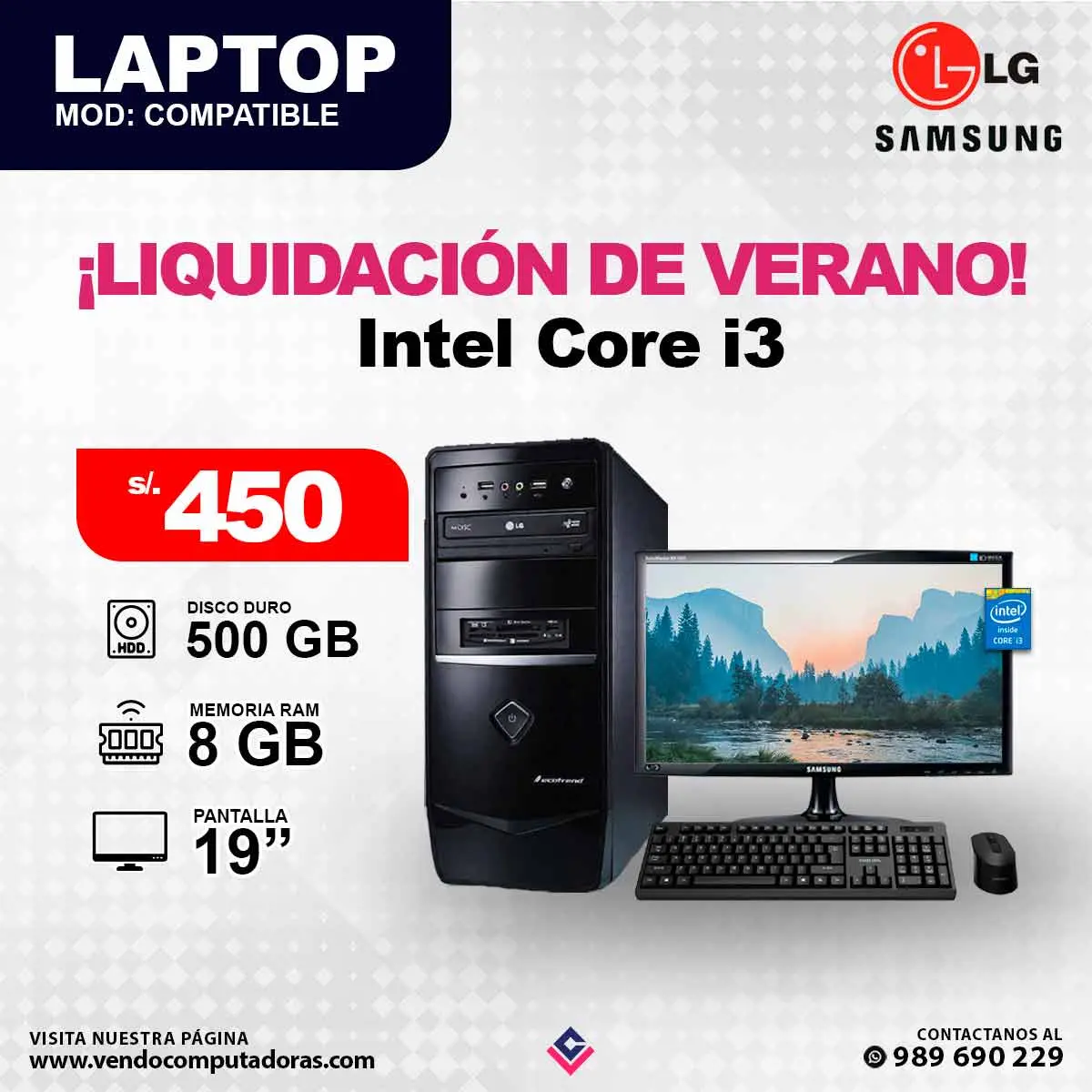 Trabaja sin interrupciones, ni preocupaciones. Especificaciones: Intel Core i3 | RAM 8 GB | HDD 500 GB | Modelo: COMPATIBLE Pantalla: 19 Lista para usar desde el primer minuto ¡Mouse y teclado de obsequio! Ideal para trabajo, estudio u oficina Entrega rápida en Lima Garantía asegurada Escríbenos al 989 690 229 ¡No te quedes sin la tuya!