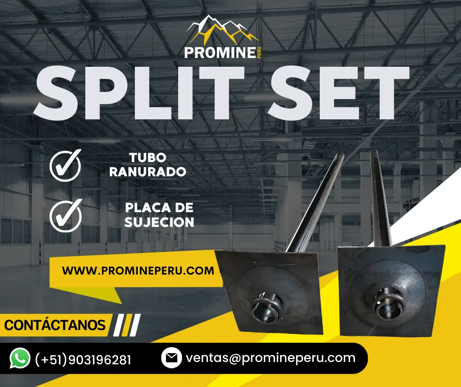 El Estabilizador de Fricción SPLIT Set, es un tubo de acero ranurado, con un extremo cónico para facilitar su inserción en un taladro. El otro extremo tiene un anillo soldado para sostener la placa de apoyo. VENTAJAS: - Fácil instalación incluso con mallas. - No requiere torque ni aditivos. - Bajo Costo. - Refuerzo inmediato después de su instalación. Contáctenos: PROMINE PERU Teléfono: (511)-7584483 Celular: 903196281 - 968712557 E-mail: ventas@promineperu.com AREQUIPA-PERÚ www.promineperu.com
