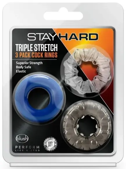 Stay Hard Paquete de 3 anillos para el pene de triple elasticidad. Juega duro, juega cómodo! El paquete de 3 anillos para pene Stay Hard Triple Stretch te ofrece tres anillos que se sienten bien, lucen sexys, aumentan la presión y amplían tus posibilidades orgásmicas.