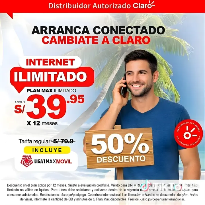 ¿ , PREPAGO O POSTPAGO ¡ ¡Haz el cambio a Claro con nuestro Plan Ilimitado por solo S/39.95 al mes! Obtendrás un 50% de descuento durante los primeros 12 meses. Oferta exclusiva disponible online. https://wa.me/51960681804 Requiere evaluación con Dni ¡SUPER PROMO INTERNET HOGAR! No se paga adelantado Requiere evaluación con DNI y cobertura