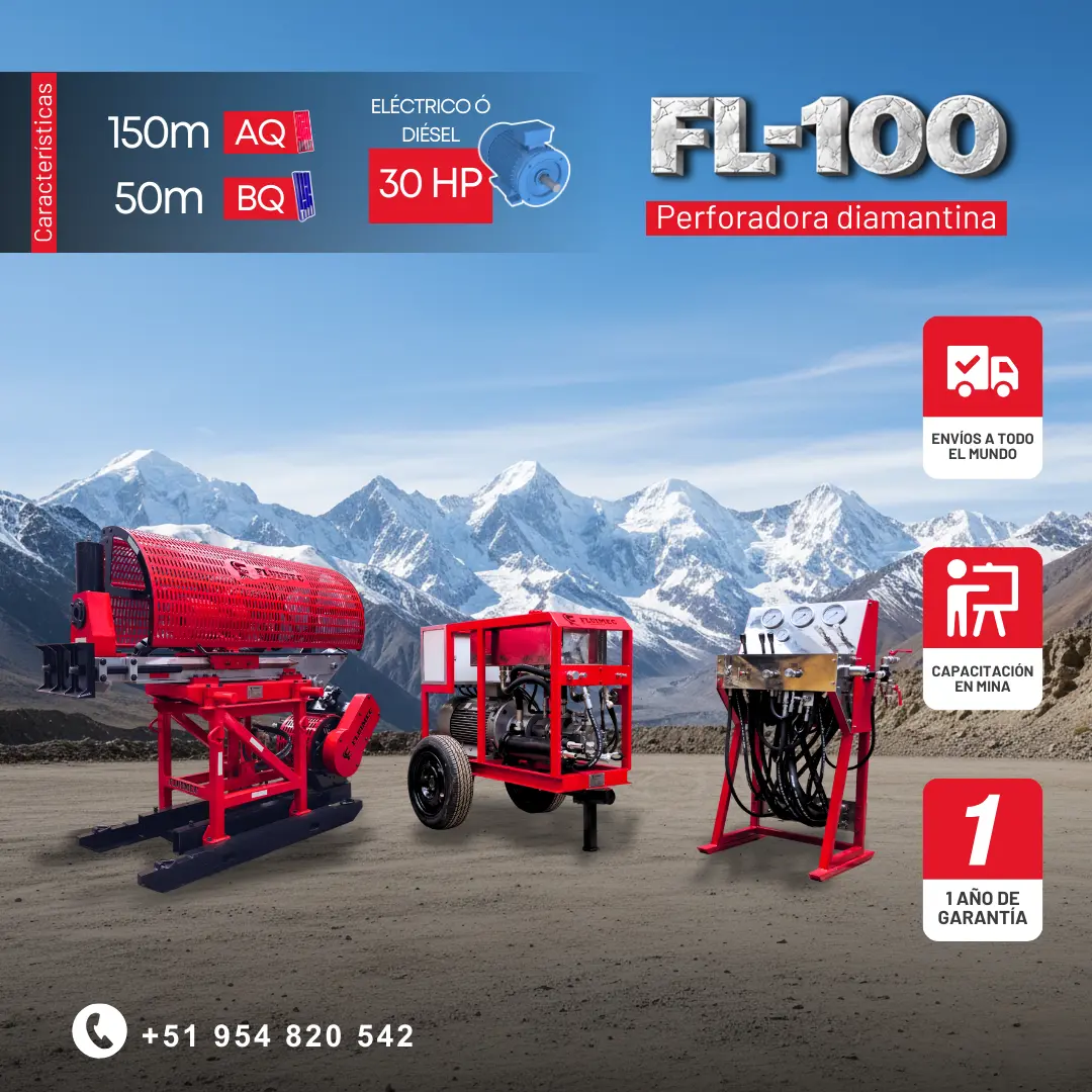 PERFORADORA PACKSACK FL-100 Explora hasta 150 m en AQ y 50 m en BQ, con testigos de 27 mm y 36 mm. Cuenta con una potencia de 30 HP y un abanico de trabajo de 180°, ideal para perforaciones y sondajes precisos. Somos Fluimec, fabricantes y distribuidores de la marca Packsack. Garantizamos el stock permanente de accesorios y repuestos originales. ¡SOLICITA TU COTIZACIÓN AHORA! 51 954 820 542 cotizaciones@fluimec.com www.fluimec.com www.packsack.com.pe Capacitación en mina gratuita - Garantía 1 año