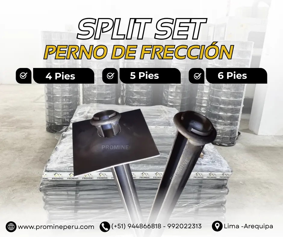 Split Set de 5 pies Sistema de sostenimiento ampliamente utilizado en minería que permite instalación rápida y alta capacidad de sujeción, contribuyendo a estabilizar las excavaciones subterráneas. Solicita más información PROMINE - SEDE LIMA: Consultas: Móvil | WhatsApp Celular: 944866818 - https://wa.link/bkcrr3 Celular: 987212054 - https://wa.link/7h770l Celular: 968712557 - https://wa.link/hbiyxd Celular: 992022313 - https://wa.link/cxff32 Correo: ventas@promineperu.com Catalogo: https://heyzine.com/flip-book/5eb58e72af.html