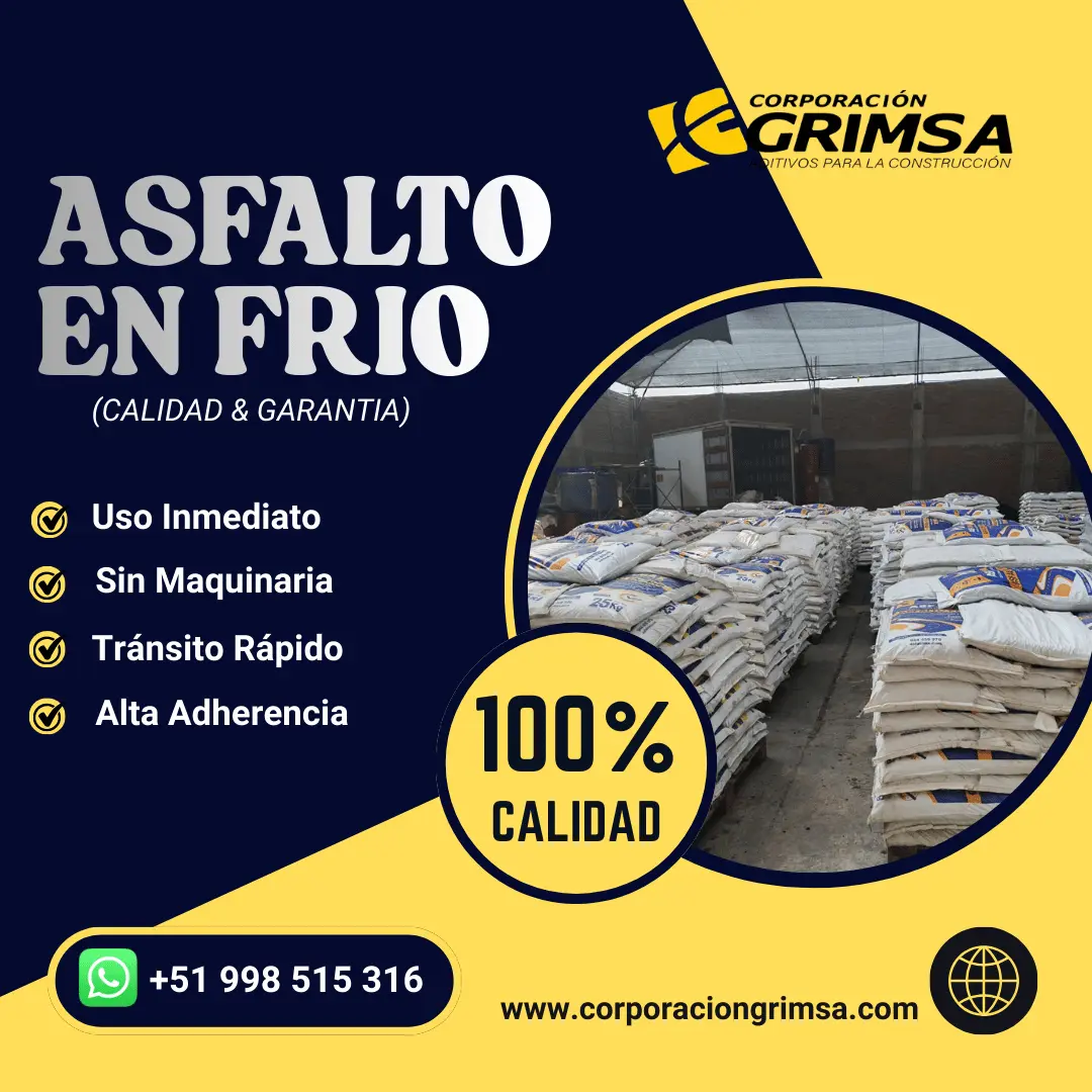 ¿Cansado de baches que dañan tu vehículo o tu negocio? Con nuestro Asfalto en Frío, ¡la solución está en tus manos! - Presentación Práctica: Disponible en sacos de 25 kilos para un fácil manejo y transporte. - Listo para Usar: Úsalo directo del envase sin necesidad de calentar la mezcla. - Sin Maquinaria: No requiere equipos pesados ni expertos para su aplicación. - Alta Adherencia: Se pega eficazmente a concreto, metal y madera. 100% CALIDAD & GARANTÍA respaldada por Corporación GRIMSA. "...y lo mejor de todo: ¡Despachamos a todo el Perú! No importa si estás en Lima o en provincia, llevamos tu pedido a nivel nacional. ¡Escríbenos ahora!" Contáctanos y solicita tu cotización WhatsApp: 998515316 / 927780771