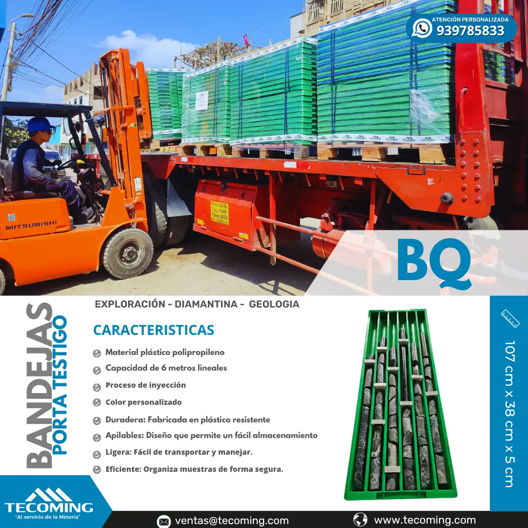 Fabricantes nacionales de bandejas porta testigo línea BQ, diseñadas para almacenamiento, registro y transporte seguro de muestras geológicas de perforación diamantina. Altos estándares de calidad comprobados para el sector minero y geológico. CARACTERÍSTICAS TÉCNICAS Línea: BQ Capacidad: 6 metros lineales de testigo Material: Polipropileno (PP) de alta resistencia Resistencia: Superior frente a impactos, humedad, rayos UV y condiciones extremas Proceso: Inyección plástica de precisión Diseño ergonómico y apilable con fondo reforzado Sistema de drenaje integrado Área lateral para rotulado o etiquetas Personalización: Diversos colores, etiquetado grabado o adhesivo Compatible con tapas y separadores línea BQ ACCESORIOS COMPLEMENTARIOS Tapa porta testigo Separadores / Tacos APLICACIONES Exploración minera superficial y subterránea Perforación diamantina BQ Laboratorios geológicos y áreas de registro de testigos Contáctanos: WhatsApp / Celular: ( 51) 922 111 541 ( 51) 945 901 699 ( 51) 939 785 833 ( 51) 941 691 656 Teléfono fijo: (01) 480 5856 Correo: ventas@tecoming.com Web: www.tecoming.com #MineriaSostenible #PerforacionDiamantina #MineriaDelFuturo #BandejasPortaTestigo #BandejasGeologias #PortatestigosMineros #TraysParaMuestras