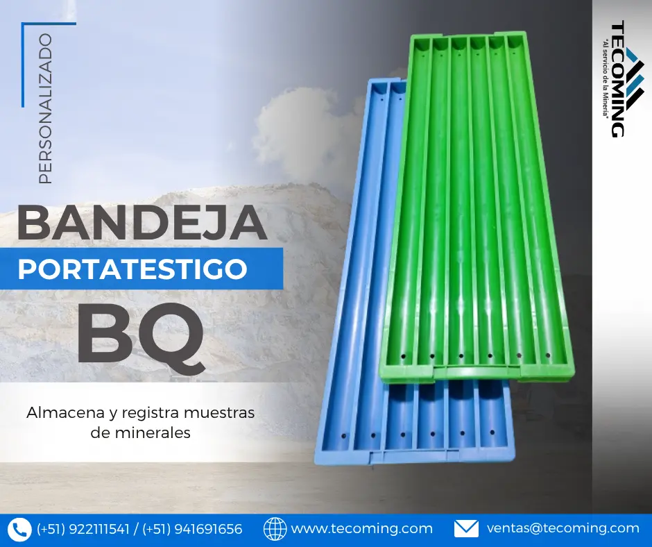 Fabricantes nacionales de bandejas porta testigo línea BQ, diseñadas para almacenamiento, registro y transporte seguro de muestras geológicas de perforación diamantina. Altos estándares de calidad comprobados para el sector minero y geológico. CARACTERÍSTICAS TÉCNICAS Línea: BQ Capacidad: 6 metros lineales de testigo Material: Polipropileno (PP) de alta resistencia Resistencia: Superior frente a impactos, humedad, rayos UV y condiciones extremas Proceso: Inyección plástica de precisión Diseño ergonómico y apilable con fondo reforzado Sistema de drenaje integrado Área lateral para rotulado o etiquetas Personalización: Diversos colores, etiquetado grabado o adhesivo Compatible con tapas y separadores línea BQ ACCESORIOS COMPLEMENTARIOS Tapa porta testigo Separadores / Tacos APLICACIONES Exploración minera superficial y subterránea Perforación diamantina BQ Laboratorios geológicos y áreas de registro de testigos Contáctanos: WhatsApp / Celular: ( 51) 922 111 541 ( 51) 945 901 699 ( 51) 939 785 833 ( 51) 941 691 656 Teléfono fijo: (01) 480 5856 Correo: ventas@tecoming.com Web: www.tecoming.com #MineriaSostenible #PerforacionDiamantina #MineriaDelFuturo #BandejasPortaTestigo #BandejasGeologicas #PortatestigosMineros #TraysParaMuestras