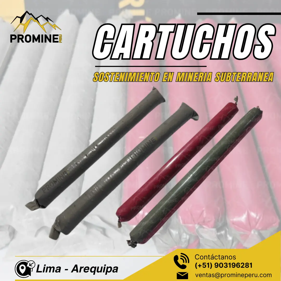 Son fabricados para la instalación de pernos de anclaje garantizando seguridad y un eficaz sostenimiento en el sector minero y obras civiles. Estos elementos se introducen en los taladros(perforaciones), luego se inserta el perno de anclaje mediante la rotación. VENTAJAS: Fácil de utilizar, rápida y segura. Alta resistencia a la compresión. Impide la formación de nuevas fisuras. Alto poder de fijación en la roca. Impide la corrosión del perno. No provoca toxicidad. Contáctenos: PROMINE PERU Teléfono: (511)-7584483 Celular: 903196281 - 968712557 E-mail: ventas@promineperu.com AREQUIPA-PERÚ www.promineperu.com