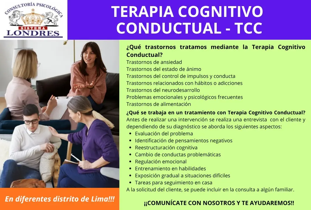 Transforma tu bienestar emocional con la Terapia Cognitivo Conductual En Consultoría Psicológica Sistema Londres te ayudamos a identificar pensamientos negativos, mejorar tus emociones y cambiar conductas que afectan tu vida diaria. Nuestro equipo profesional te brinda atención personalizada en diferentes distritos de Lima. Más información: https://consultorialondres.com/ Agenda tu cita: 996 913 950