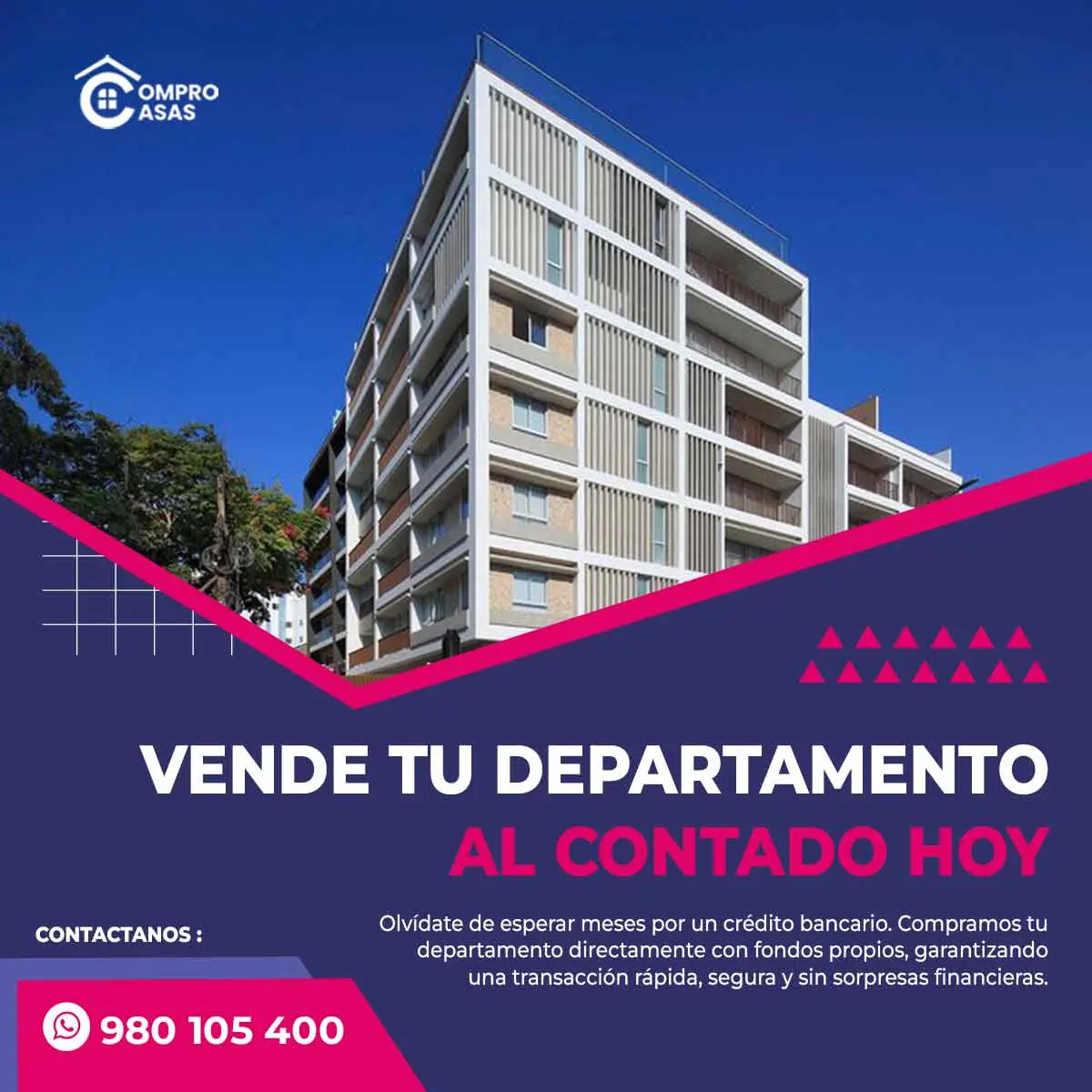 Olvidate de esperar meses por un credito bancario. Compramos tu departamento directamente con fondos propios , garantizando una transaccion rapida, segura y sin sorpresas financieras.