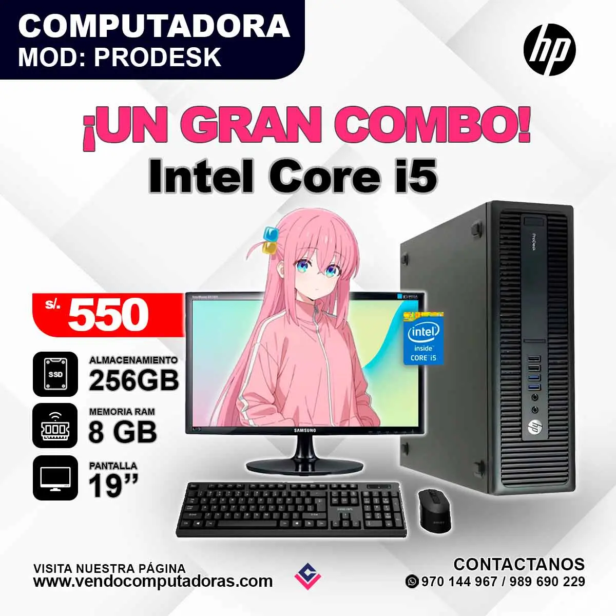Especificaciones: EQUIPO: PC MARCA: HP MODELO: PRODESK PROCESADOR: INTEL CORE I5 MEMORIA RAM: 8 GB ALMACENAMIENTO: 256 SSD MONITOR SANSUNG PANTALLA:19" WIDE SCREEN MODELO: BX1931N Teclado Mouse ¡GRATIS! Lista para usar desde el primer minuto Ideal para trabajo Entrega rápida en Lima Garantía asegurada Escríbenos al 989 690 229 - 970 144 967